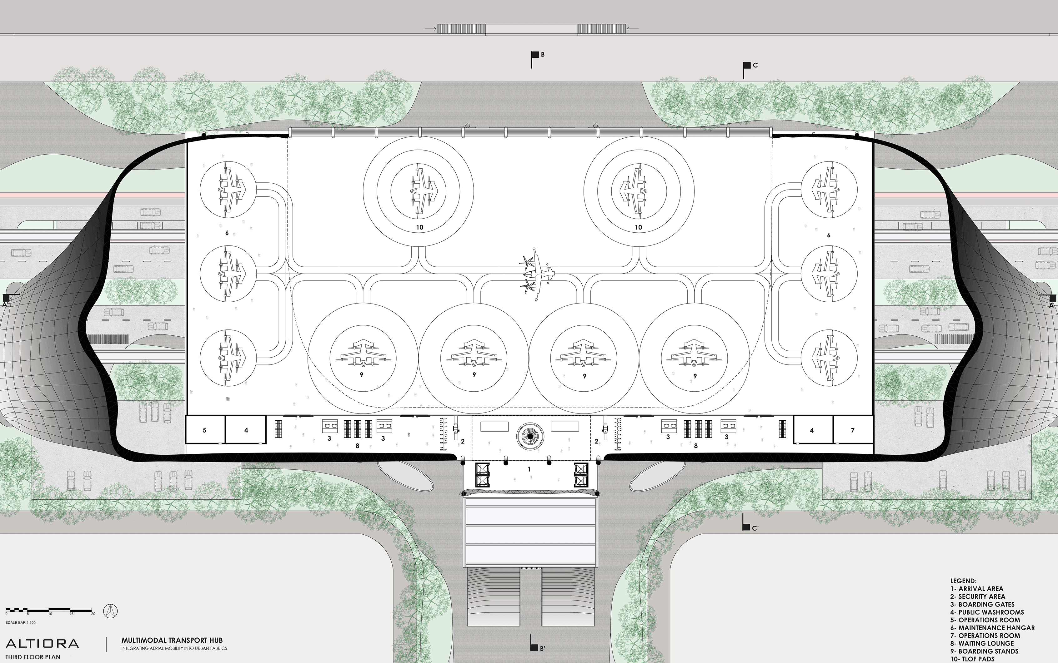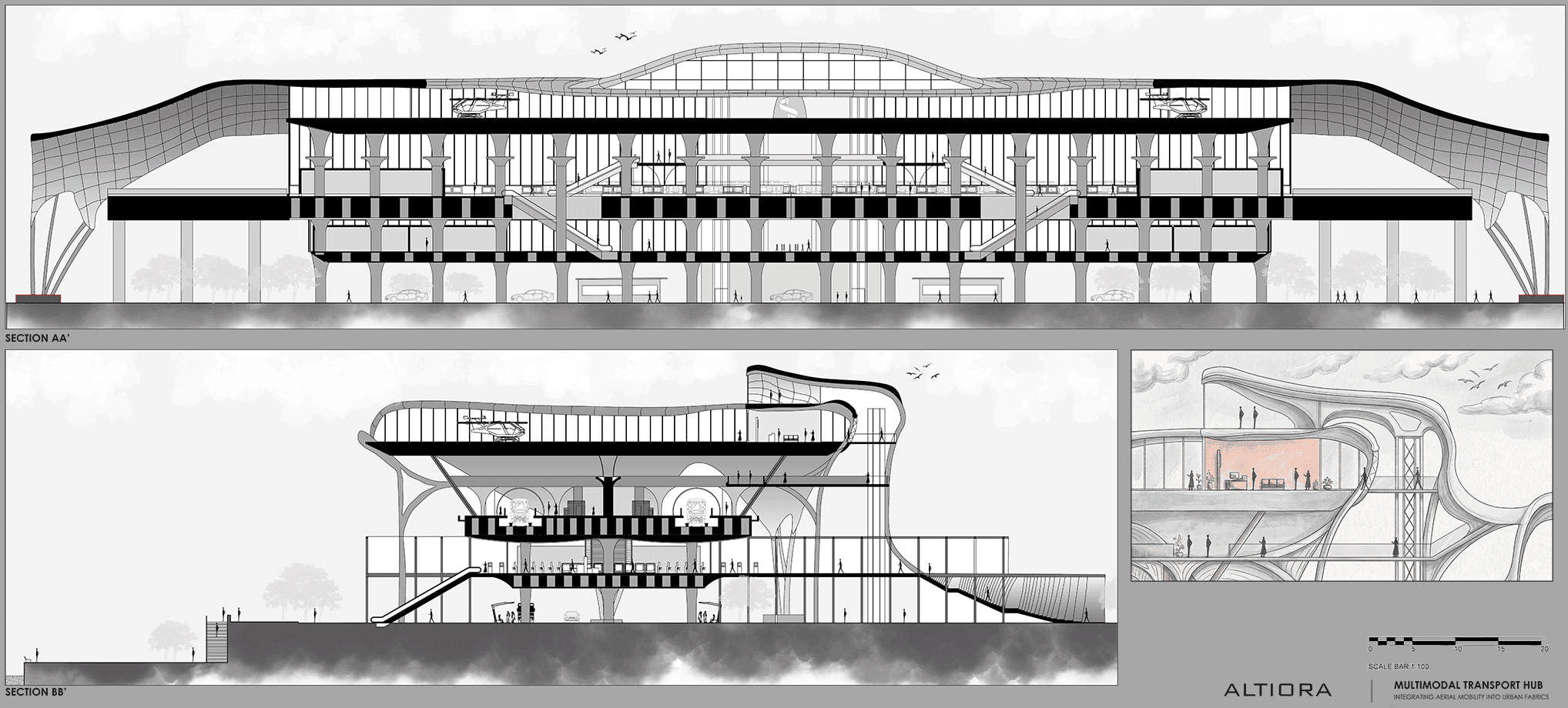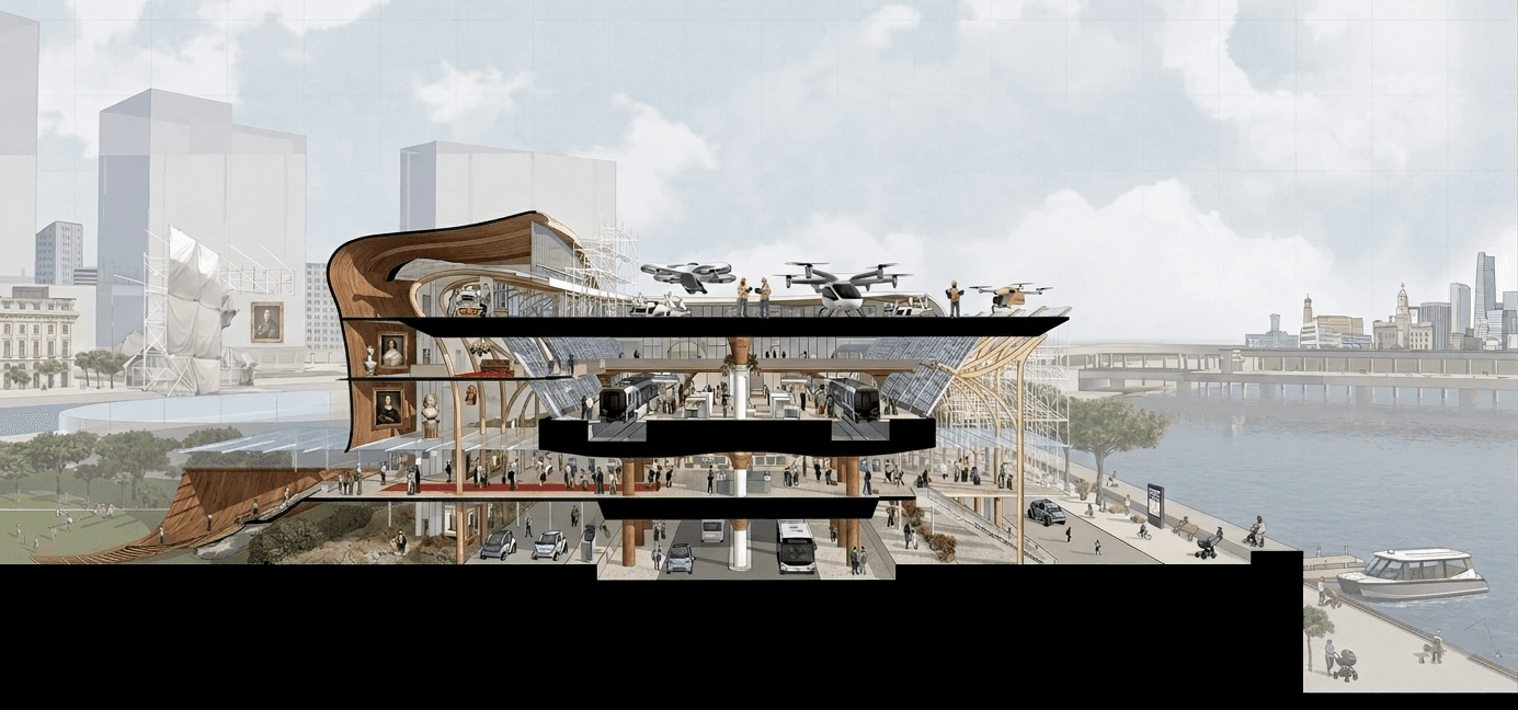 Altiora reimagines urban mobility as an integrated experience, bringing together eVTOL, metro, and ground-level transit within a unified hub. The project explores seamless movement, spatial clarity, and the layering of circulation systems to create an efficient yet legible public infrastructure.