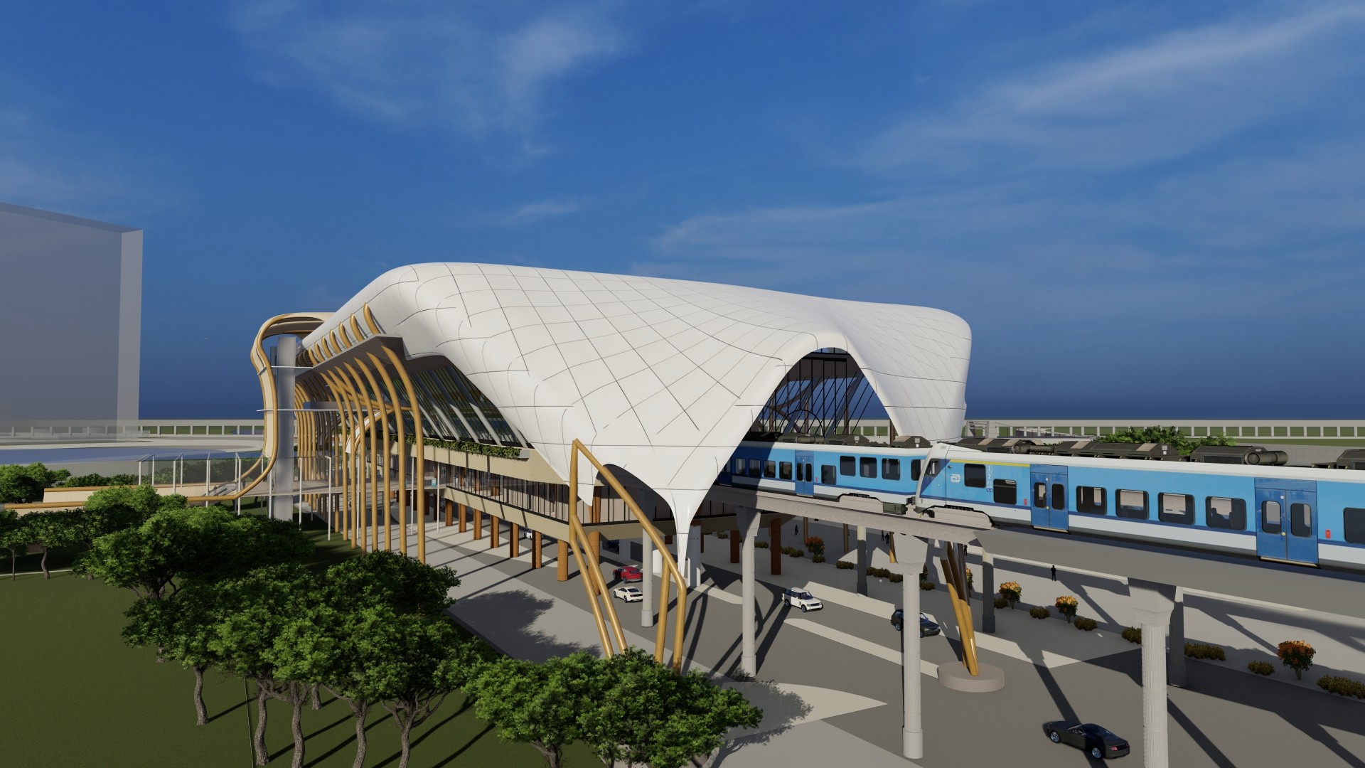Evolved the form through a fusion of orthogonal (existing metro infrastructure) and parametric (futuristic vertiport) geometries, representing present and future mobility.Design Resolution
