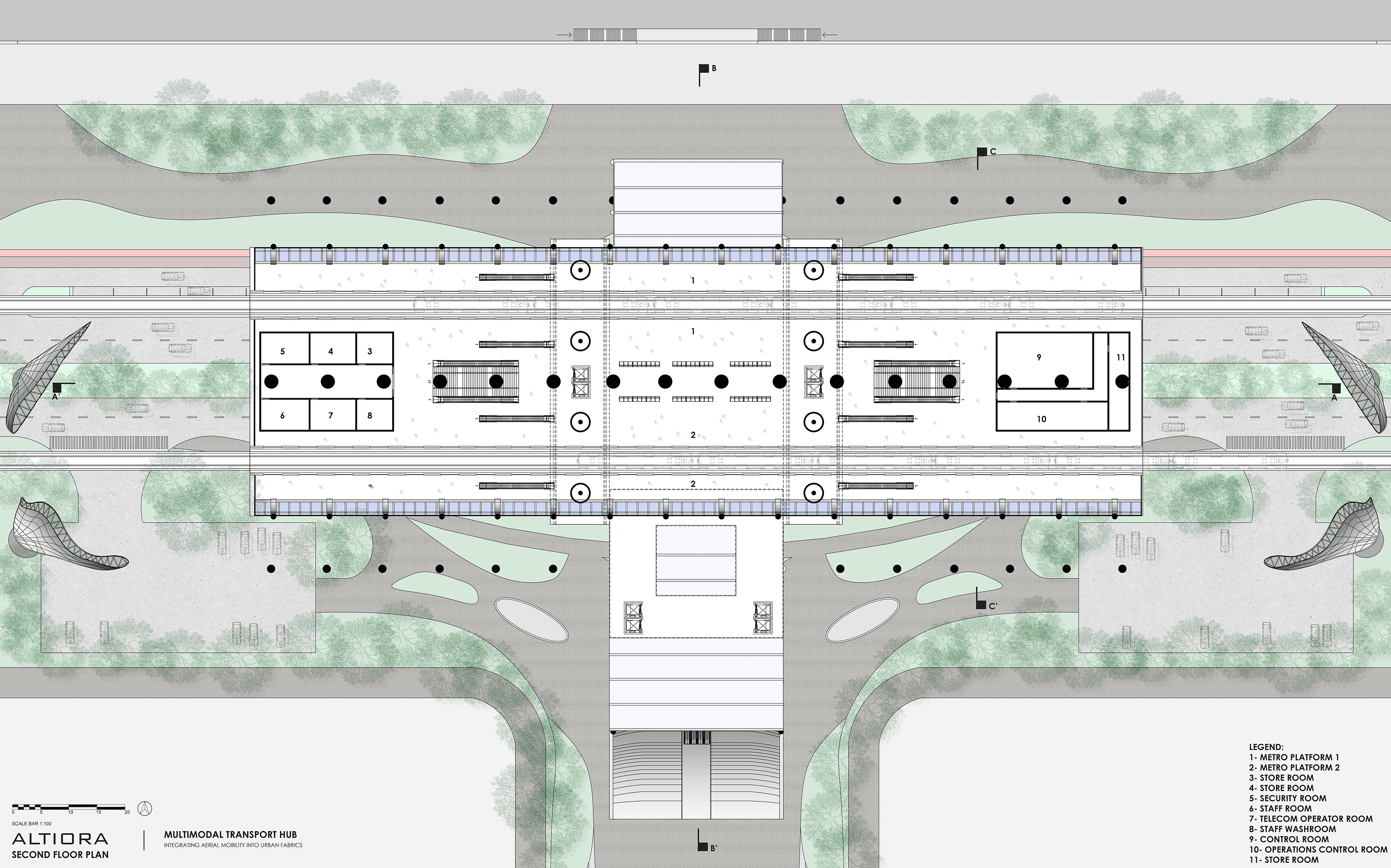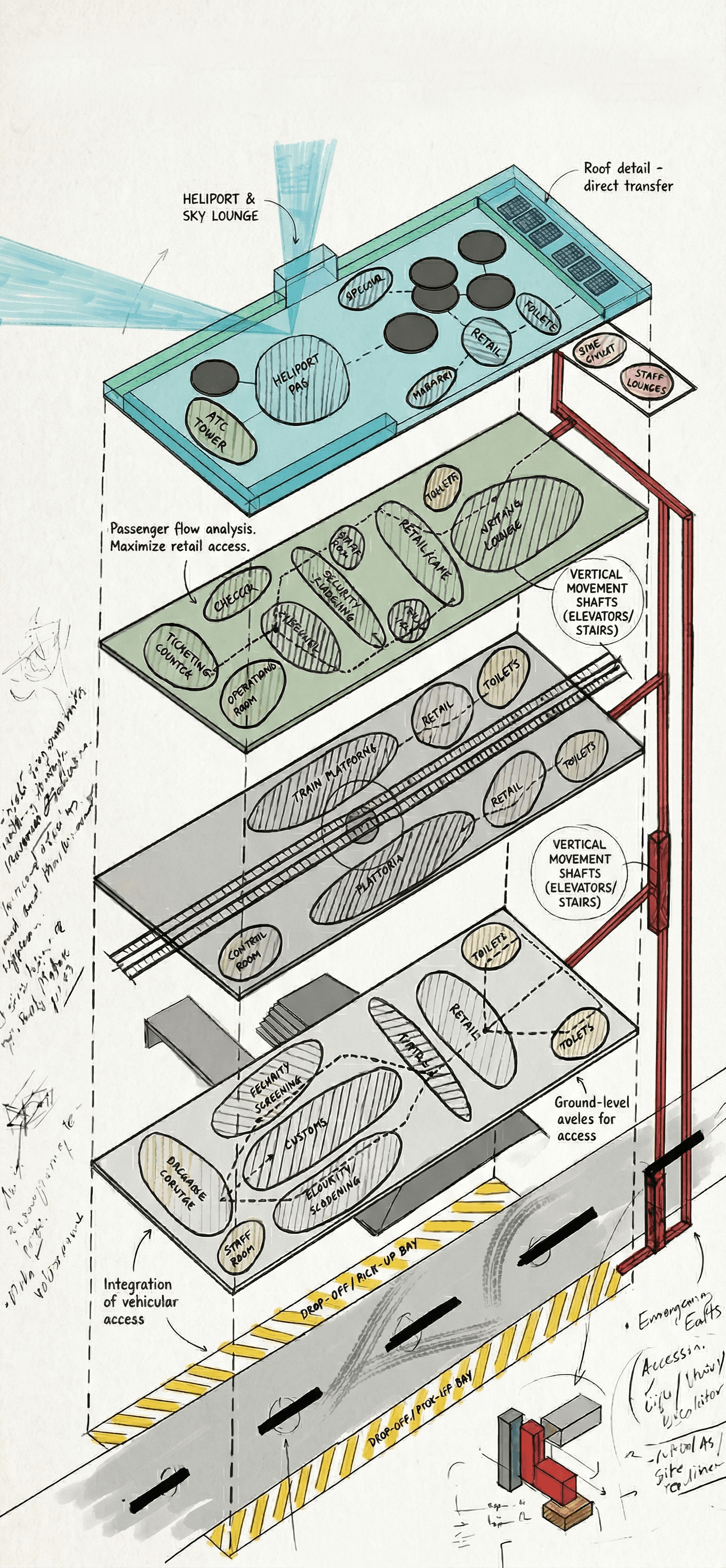 Developed level-wise diagrams and physical/digital models to test spatial organization, zoning, and vertical circulation strategies.Multimodal Integration