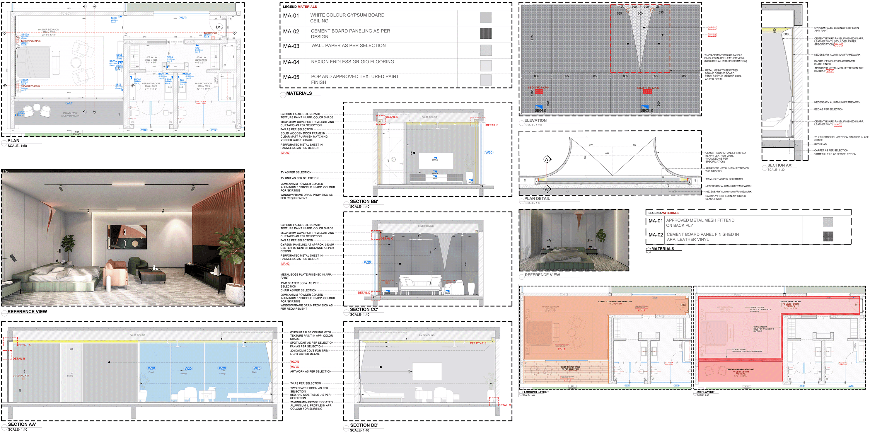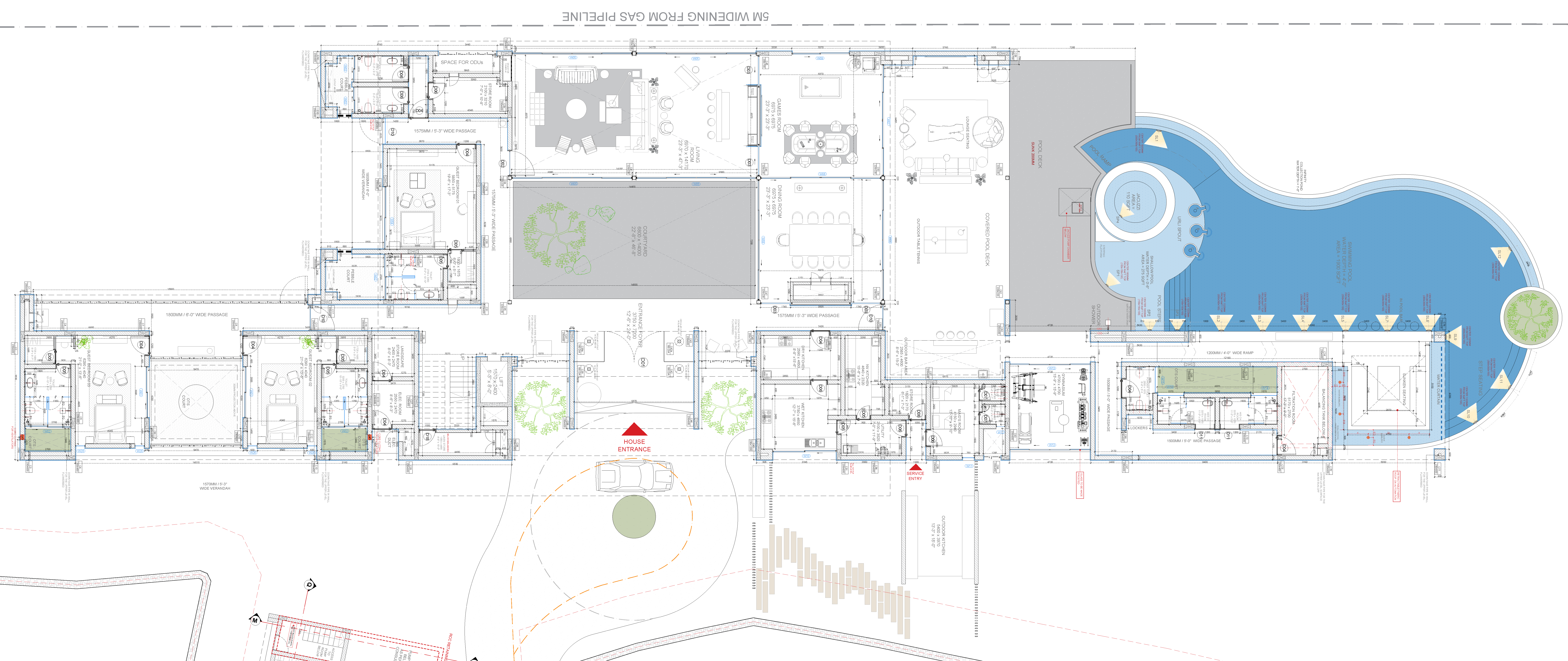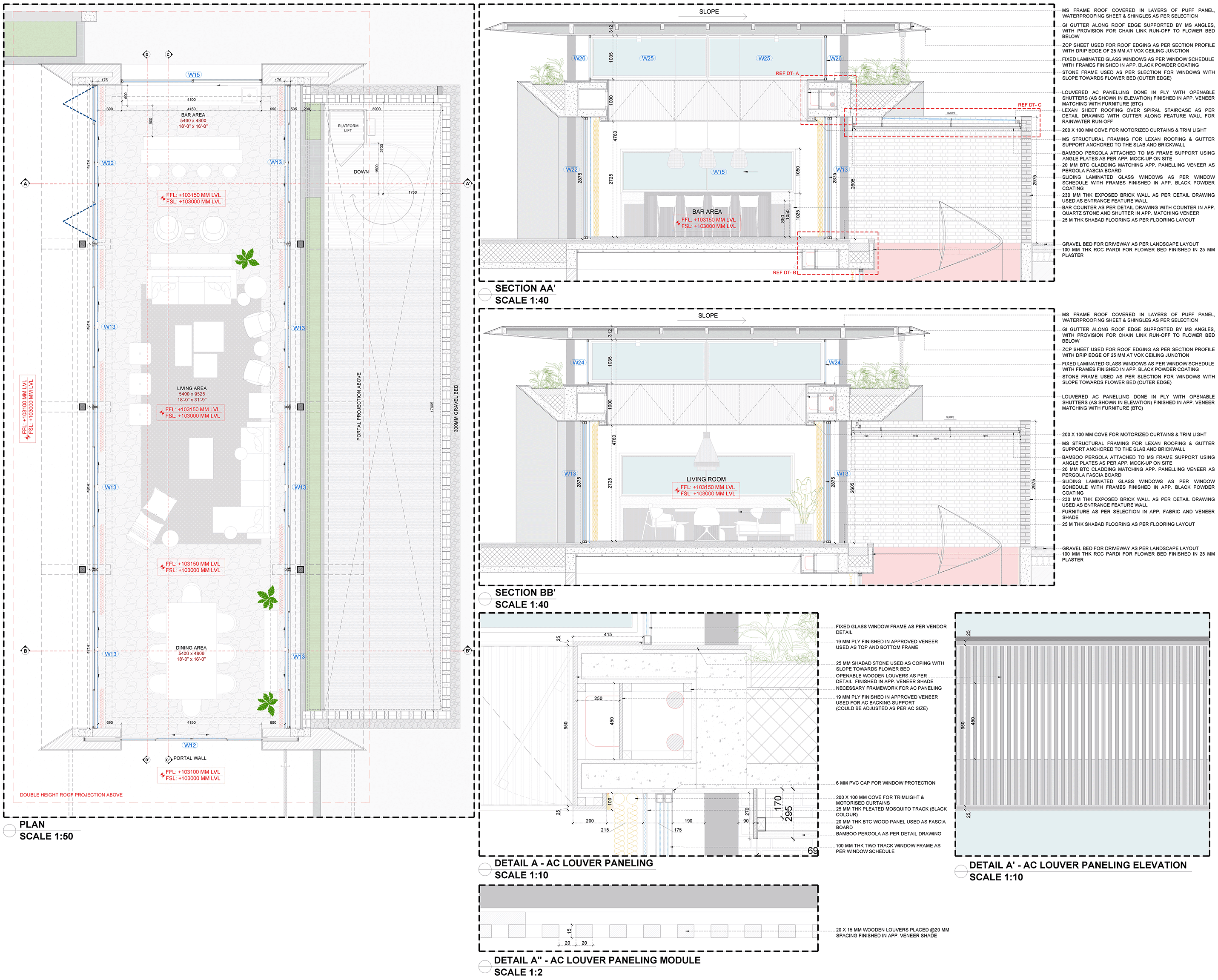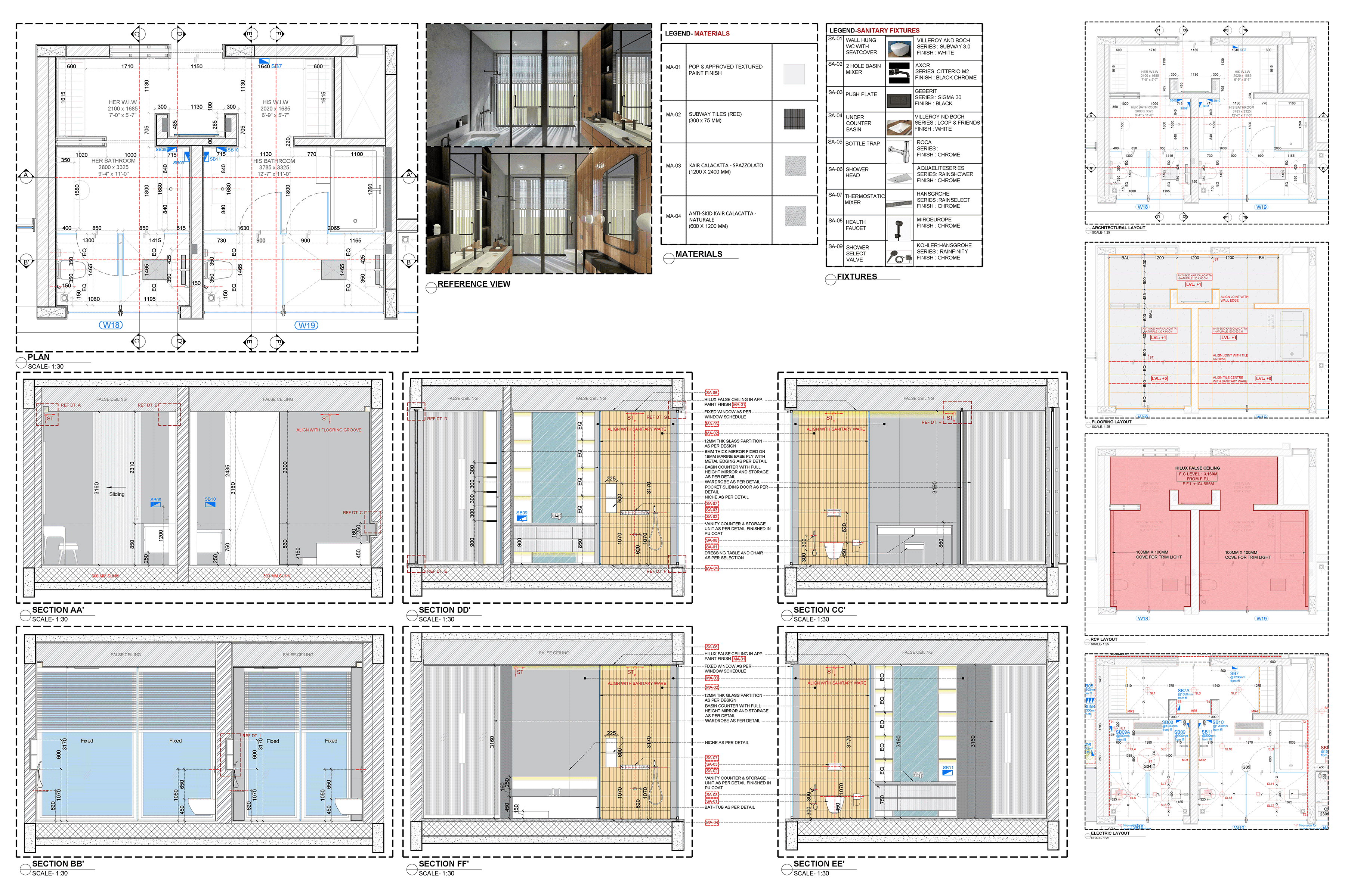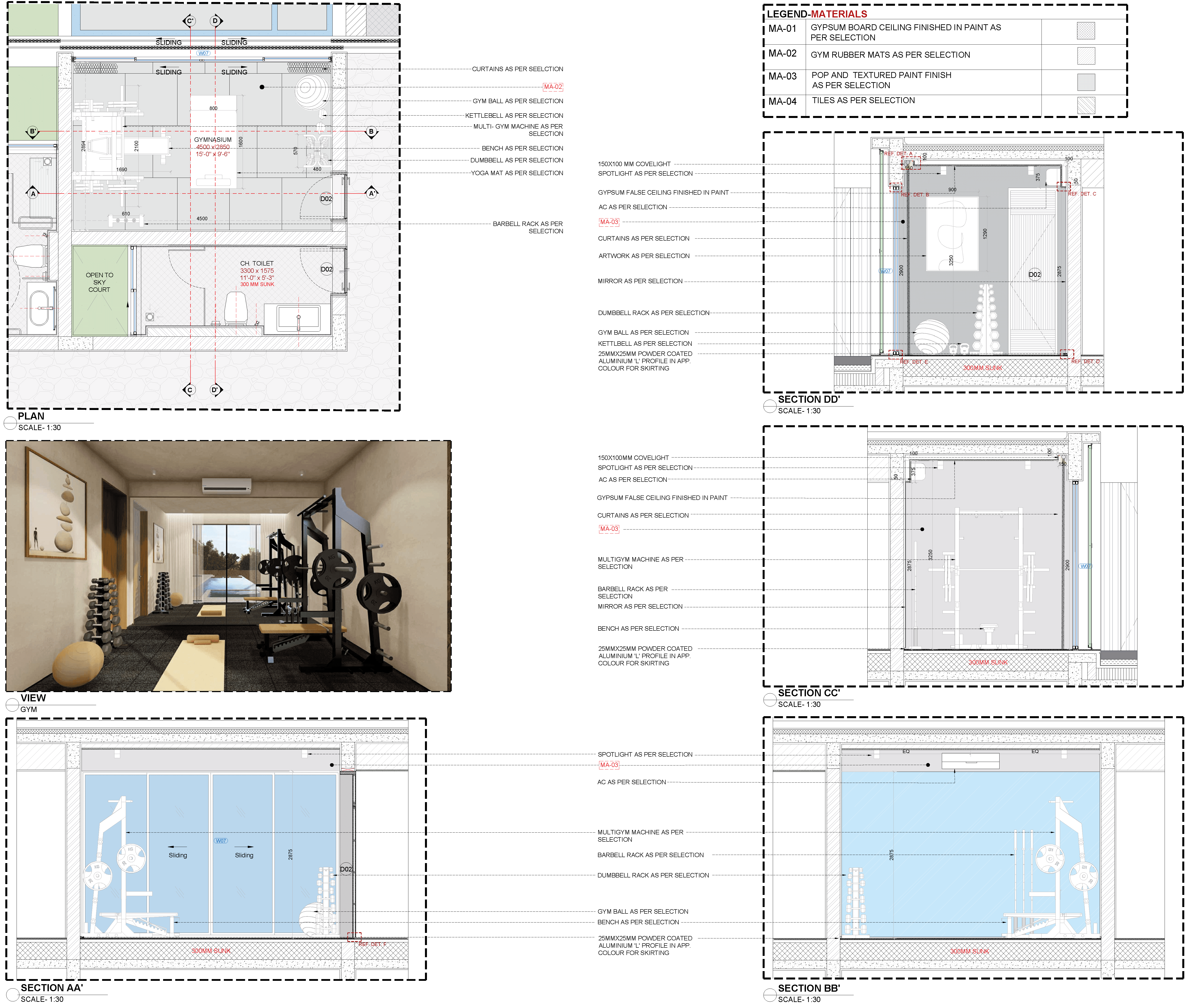 Prepared detailed plans, sections, and elevations across multiple spaces including living areas, bathrooms, gym, and recreation zones, contributing to comprehensive drawing sets.Interior Detailing & Execution Drawings