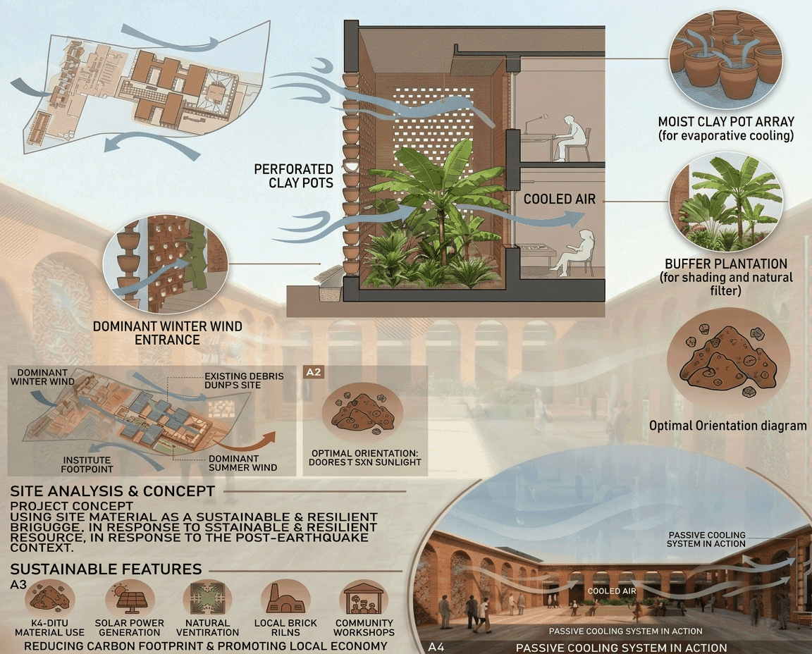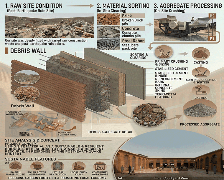 Reclaimed and treated construction waste from the site to create debris walls, transforming a post-disaster residue into a sustainable building material.Climate-Responsive Strategy