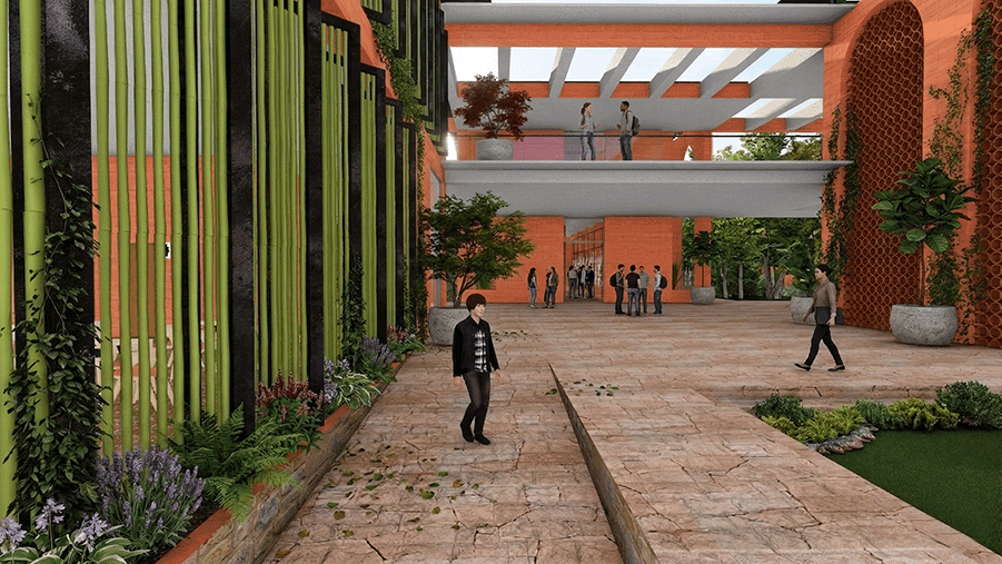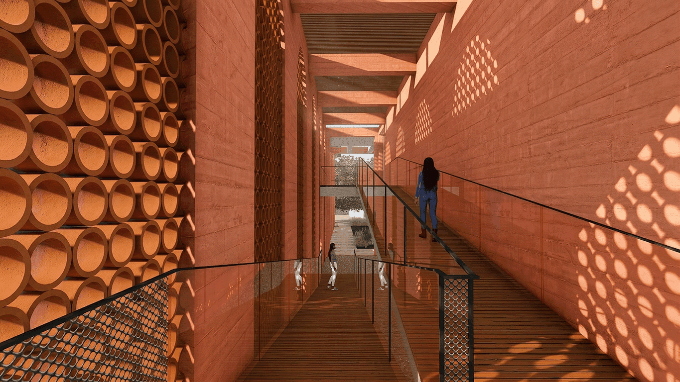 Designed passive cooling systems using buffer zones with plantations and moist earthen pots that cool incoming air naturally, eliminating the need for mechanical air conditioning.Spatial Planning & Buffering