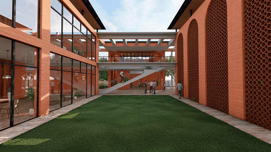 Oriented the built form to capture prevailing winds while minimizing harsh solar exposure, ensuring the building responds sensitively to Bhuj’s hot climate.