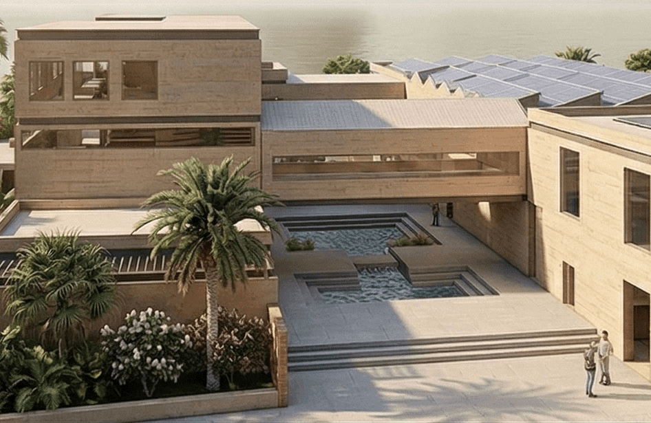 Derived spatial elements from traditional pol houses, especially the concept of courtyards as social and climatic anchors within the built form.Material & Texture Strategy