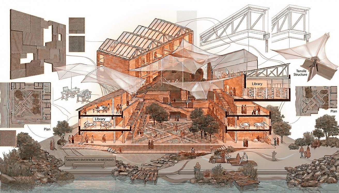 Developed a program responding to both citizens and tourists, including exhibition spaces, an auditorium, café, and interactive areas to showcase Ahmedabad’s culture and heritage.Cultural & Architectural References