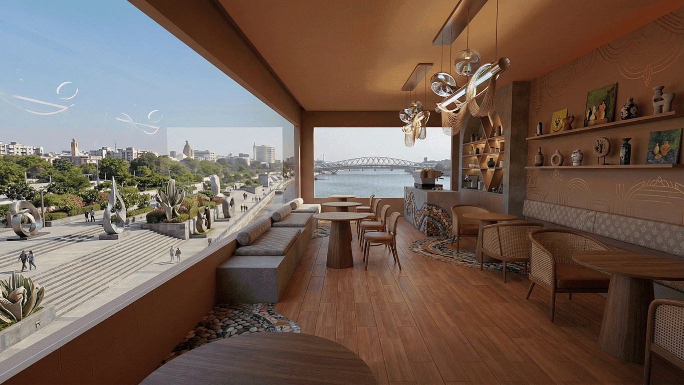 Sangam is envisioned as a public-facing institution along the Sabarmati riverfront, bringing together spaces such as a café, auditorium, and library to engage the city. The project explores the relationship between built form and the public realm, creating a setting for gathering, learning, and cultural exchange within the urban fabric.